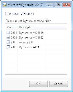============== 1. In the AOT, create a new job named SysListSelectSingle: static void SysListSelectSingle(Args _args) { container choices; container headers; container selection; container selected; boolean ok; choices = [ ["3.0\nAxapta 3.0", 1, false], ["4.0\nDynamics AX 4.0", 2, false], ["2009\nDynamics AX 2009", 3, false], ["2012\nDynamics AX 2012", 4, true]]; headers = ["Version", "Description"]; selection = selectSingle("Choose version", "Please select Dynamics AX version", choices, headers); [ok, selected] = selection; if (ok && conLen(selected)) { info(strFmt("You've selected option No. %1", conPeek(selected,1))); } } 2. Run the job to display the options: 3. Select any of the options, click the OK button, and notice your choice displayed in the Infolog: Notice that in this case, the returned value is a container holding the selected options. Источник: http://axmas.blogspot.com/2012/11/an...m-options.html