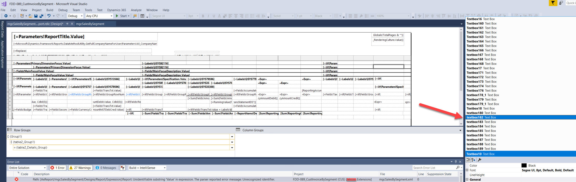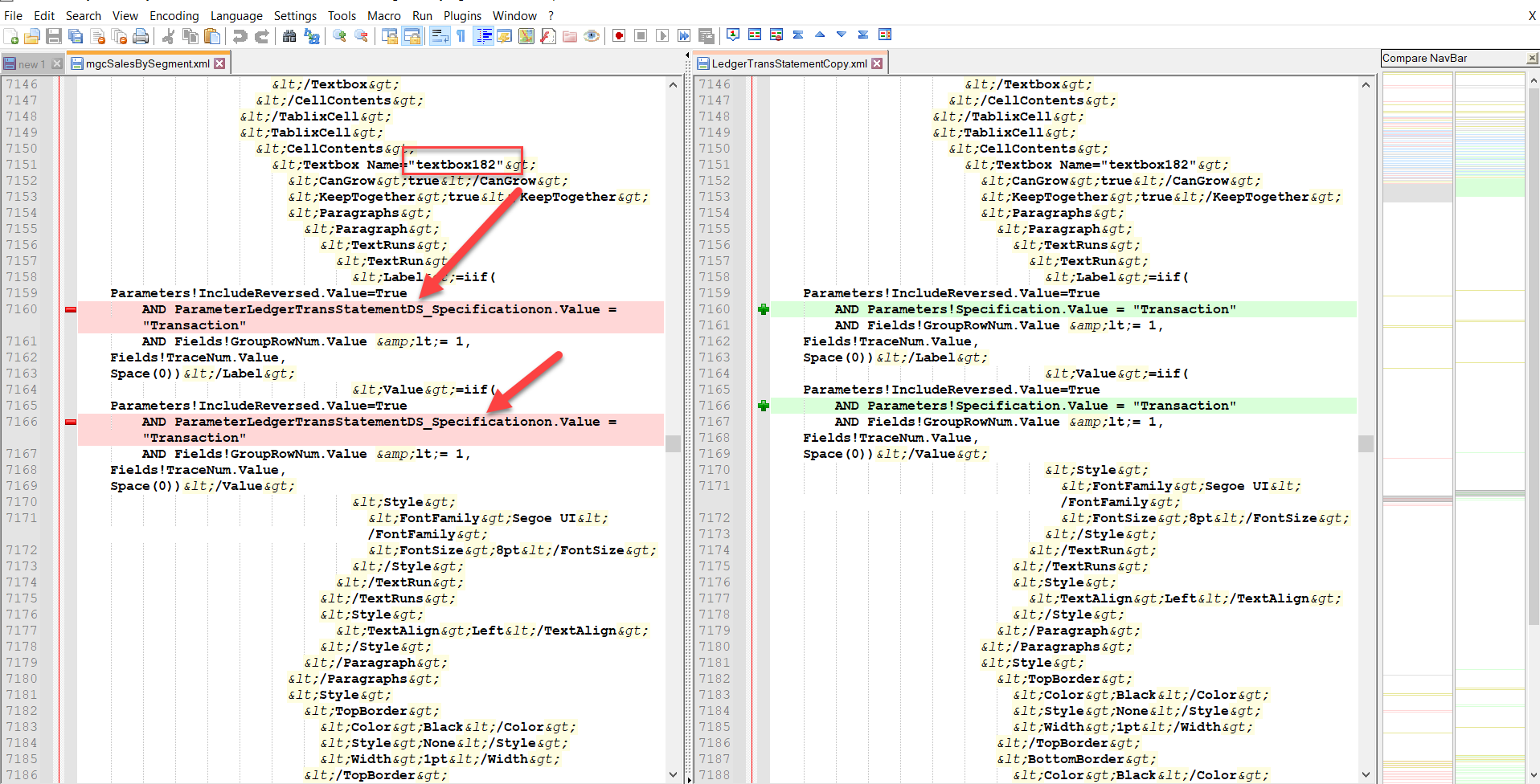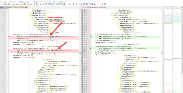 ============== Sometimes after copying an existing SSRS report or even just a part of its design, parser starts encountering strange errors. For example: Unidentifiable substring 'Value' in expression. the parser reported error message There must be something wrong in the mechanism responsible for copying text boxes. In most case, it replaces simple function names with predicates like Microsoft.Value etc. In my case it turned out to be even worse: some bug in strings concatenation; no matter what. The problem here is that you have no hint about the object name, where such a non-conform string was added. You can try your textboxes one by one by checking all their properties with functions inside: visibility, font, border etc, even labels for its placeholder! And it can become a nightmare when your report contains dozens of them. Fortunately there is a some workaround. You can open XML files for both of the original report and your copy of it in Notepad++ and run Compare over them (Install this Compare plugin). Then scroll down to the first bad guy: a couple of strings above you will see its name. Go back to the editor, find this textbox. Now check its corrupted property function expressions and fix it. Источник: http://alexvoy.blogspot.com/2021/03/...rs-report.html