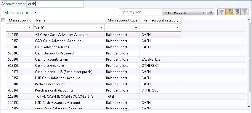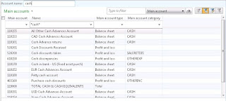 ============== 1. In the AOT, open the MainAccountListPage form and add a new StringEdit control with the following properties to the existing Filter group: Property Value Name FilterName AutoDeclaration Yes ExtendedDataType AccountName 2. Override its textChange() method with the following code: public void textChange() { super(); MainAccount_ds.executeQuery(); } 3. Override the control's enter() method with the following code: public void enter() { super(); this.setSelection(strLen(this.text()), strLen(this.text())); } 4. Override the executeQuery() method of the MainAccount data source with the following code: public void executeQuery() { QueryBuildRange qbrName; qbrName = SysQuery::findOrCreateRange(this.queryBuildDataSource(), fieldNum(MainAccount,Name)); qbrName.value(FilterName.text() ? '*'+queryValue(FilterName.text())+'*' : SysQuery::valueUnlimited()); super(); } 5. In order to test the search, open General ledger | Common | Main accounts and start typing in the Account name filter. Notice how the account list is being filtered automatically: Источник: http://axmas.blogspot.com/2012/11/cr...ch-filter.html