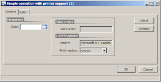 ============== RunBase framework is used when we develop a class to run an operation within Dynamics AX, such as posting a sales order or used in any data manipulation operation. If we need to batch the operation, we will commonly use the RunBaseBatch framework by extending the RunBaseBatch class. The RunBaseBatch class does not provide the access to printer such as when running a report. If you need to provide the printer support to allow users to specify the printer options in the operation, you can extend the RunBaseBatchPrintable class instead of RunBasebatch class. When extending the RunBaseBatch class, you need to override the pack() and unpack() methods. If query is used in the operation, you may need to also override the initParmDefault(), queryRun(), and showQueryValues() methods. When extending the RunBaseBatchPrintable class, in addition to the above methods, you would also need to make the following amendments:- 1) Modify the pack() to serialise the printJobSettings object (inherits from RunBaseBatchPrintable class) X++: public container pack() { ; return [#CurrentVersion, #CurrentList, queryRun.pack(), printJobSettings.packPrintJobSettings() // Serialise the printJobSettings object ]; } X++: public boolean unpack(container _packedClass) { Version version = RunBase::getVersion(_packedClass); container packedQuery; container packedPrintJobSettings; ; switch (version) { case #CurrentVersion: [version, #CurrentList, packedQuery, packedPrintJobSettings] = _packedClass; if (packedQuery) { queryRun = new QueryRun(packedQuery); } // Deserialise the printJobSettings object if (isSwappedFromServer) { printJobSettings = SysPrintOptions::newPrintJobSettingsOnServer(packedPrintJobSettings); } else { printJobSettings = new PrintJobSettings(packedPrintJobSettings); } break; default: return false; } return true; } X++: public void run() { ; info(strfmt('Selected printer is %1', printJobSettings.printerPrinterName())); // pass the printJobSettings object to run a report based on the selected printer settings reportRun = classFactory.reportRunClass(args); reportRun.init(); reportRun.printJobSettings(printJobSettings.packPrintJobSettings()); reportRun.run(); } Источник: http://waikeatng.blogspot.com/2010/1...ble-class.html